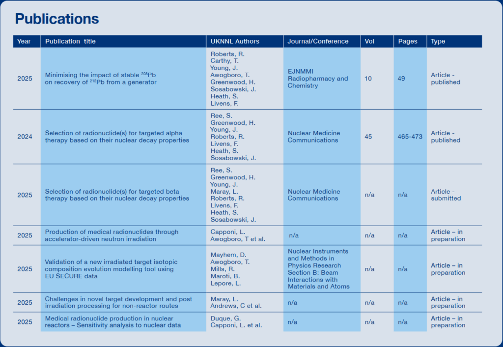 In addition, UKNNL’s Rachel Roberts is undertaking a UKNNL-funded PhD with the University of Manchester on ‘Extraction and purification of alpha emitting radionuclides from legacy sources for use in targeted alpha therapy (TAT) of cancers’.