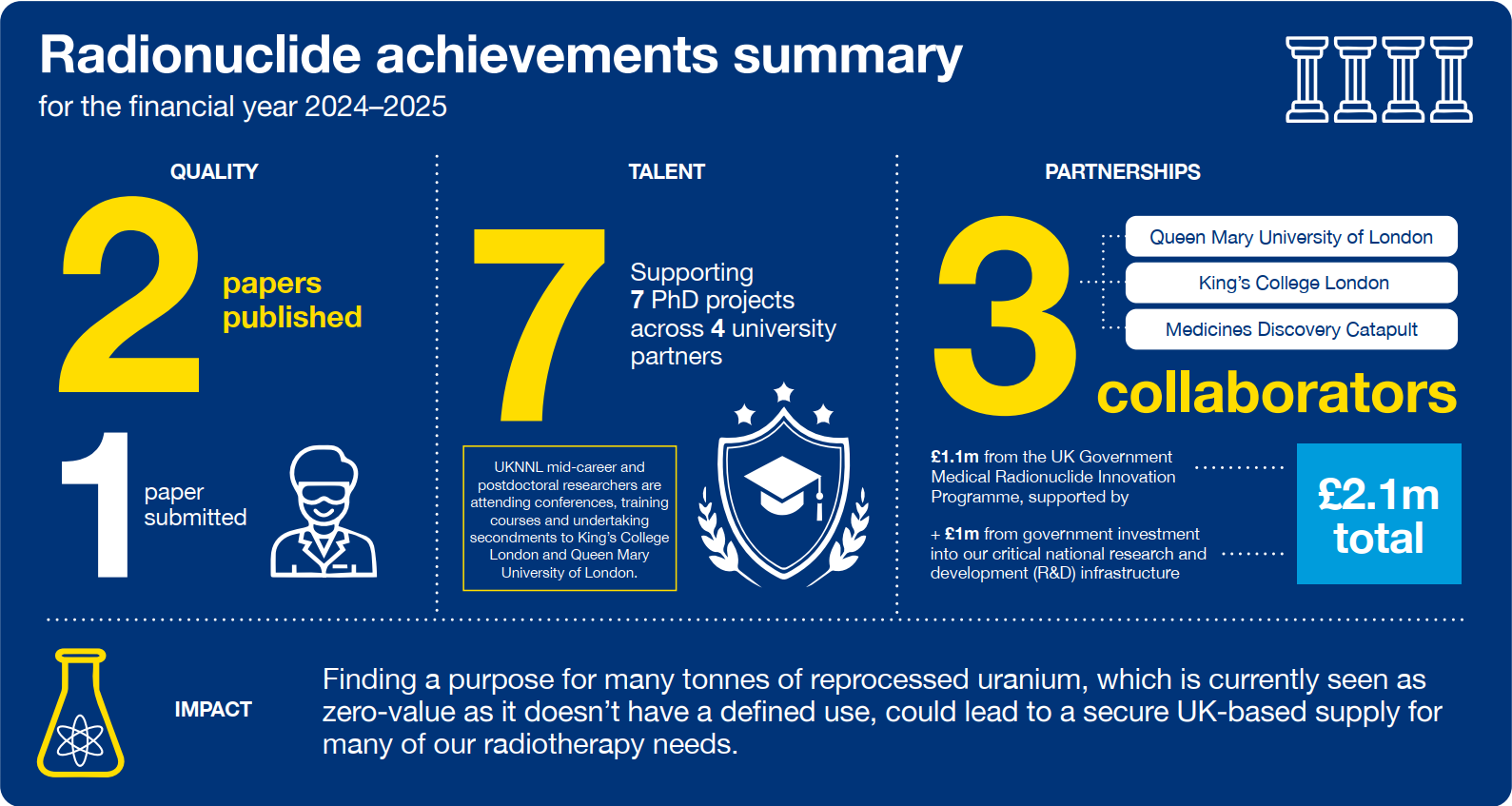 Researchers will be able to test their constructs in our laboratory to find the optimal production regime. In the long term, the knowledge and techniques developed by UKNNL will lead to development of a central production hub to supply the NHS with medical radionuclides from a UK supply chain that could last for centuries.